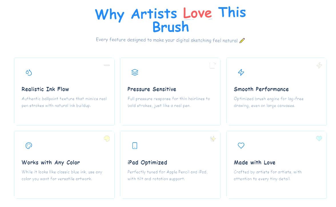 Create realistic ballpoint pen sketches with natural pressure sensitivity and authentic ink texture. Perfect for digital journaling, illustrations, and sketches.